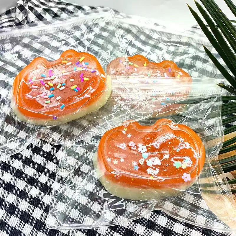 Cada bolsa incluye un Squishy gelatinoso estilo mochi, suave, pegajoso y súper apretable. Vienen en diseños y colores variados (más de 500 estilos posibles), todos enviados de manera aleatoria para que vivas la experiencia sorpresa.